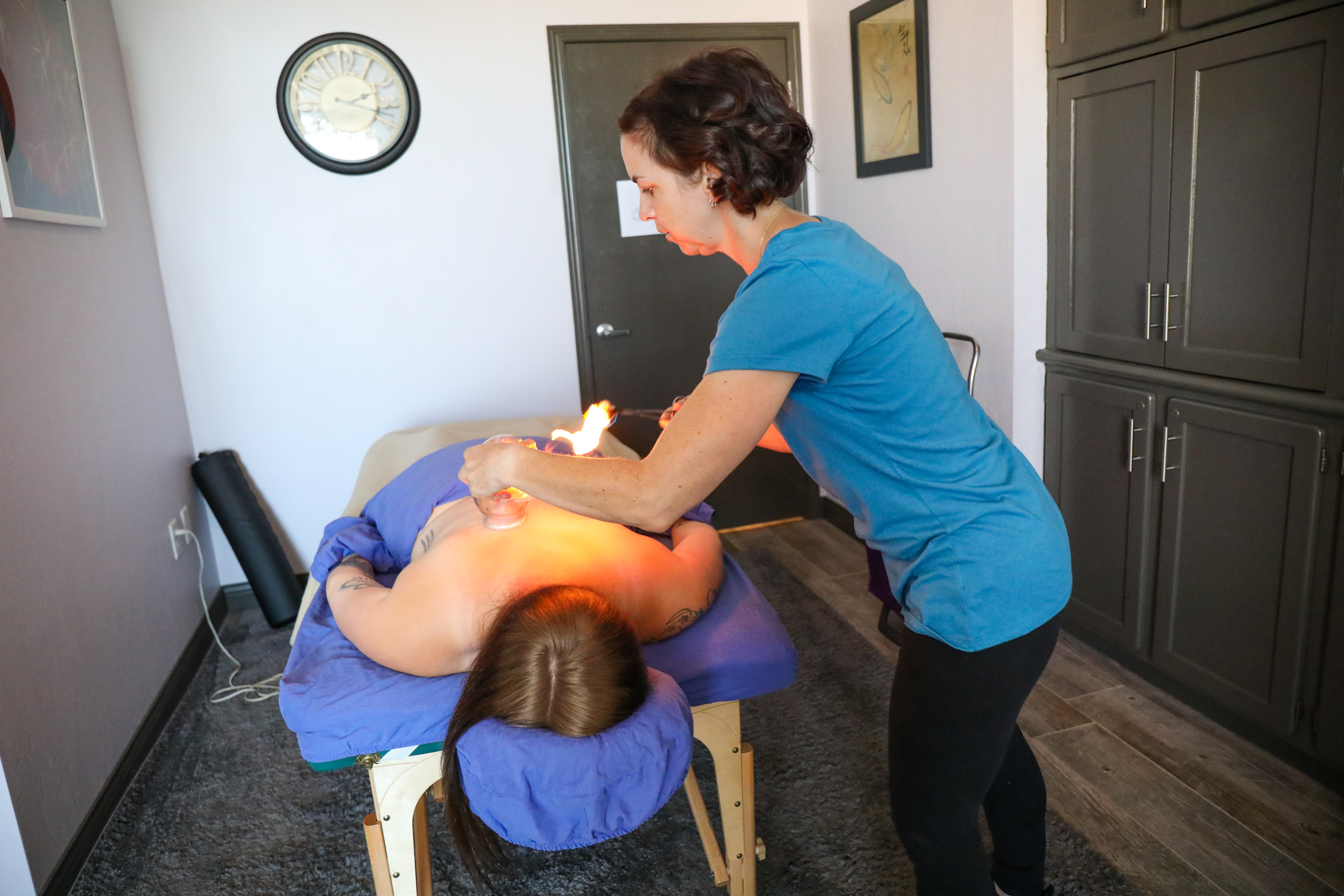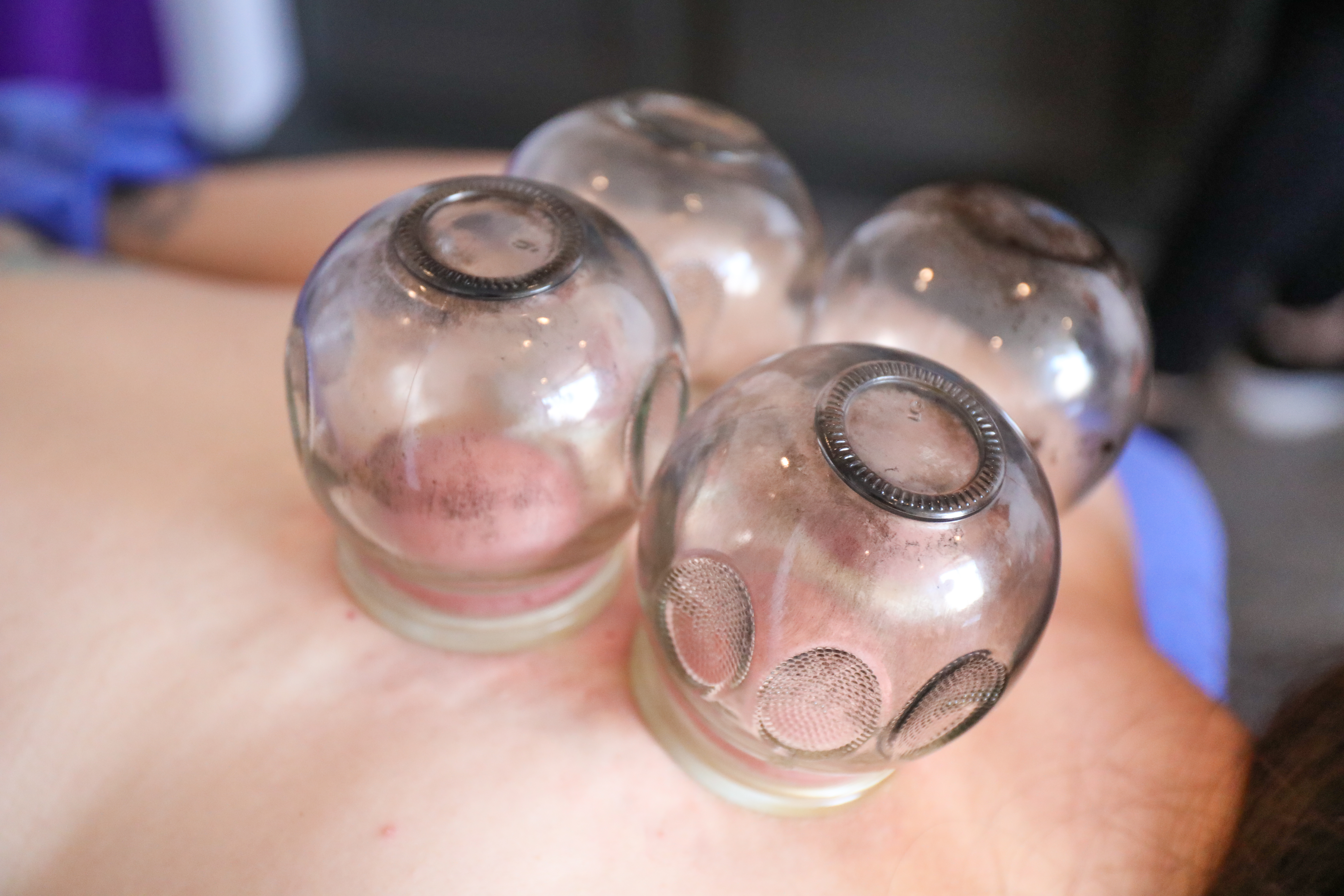 During a cupping session, a small flame briefly creates a vacuum inside glass cups, which are then placed on the skin. This suction lifts the tissue and helps pull stored toxins to the surface, where they can be more easily released. Cupping reaches up to three inches deep — affecting not only muscles but also ligaments and tendons that don’t respond as well to traditional massage.